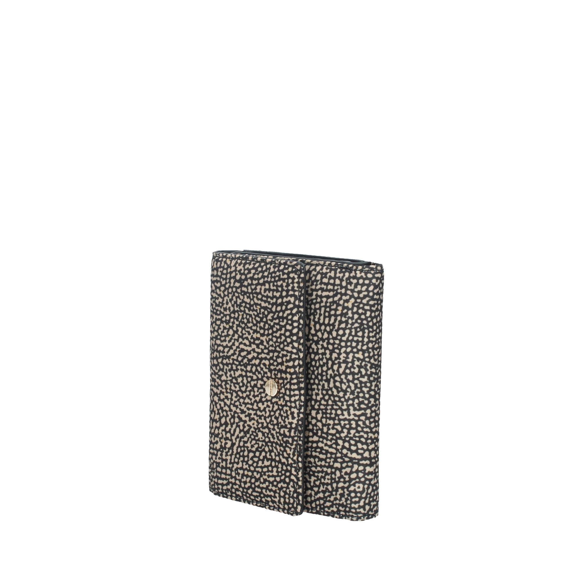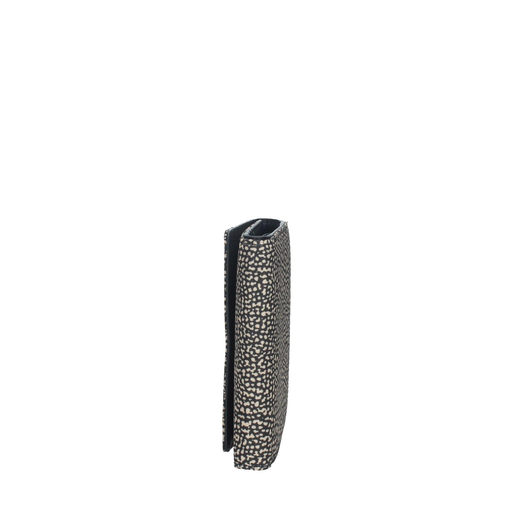 PORTAFOGLIO MEDIO IN TESSUTO CON STAMPA EFFETTO TAPIRO E PELLE, BOTTONE A PRESSIONE DI CHIUSURA. INTERNO STRUTTURATO IN MOLTEPLICI FESSURE PER TESSERE, CONTANTI E TASCA CON BOTTONE PER MONETE