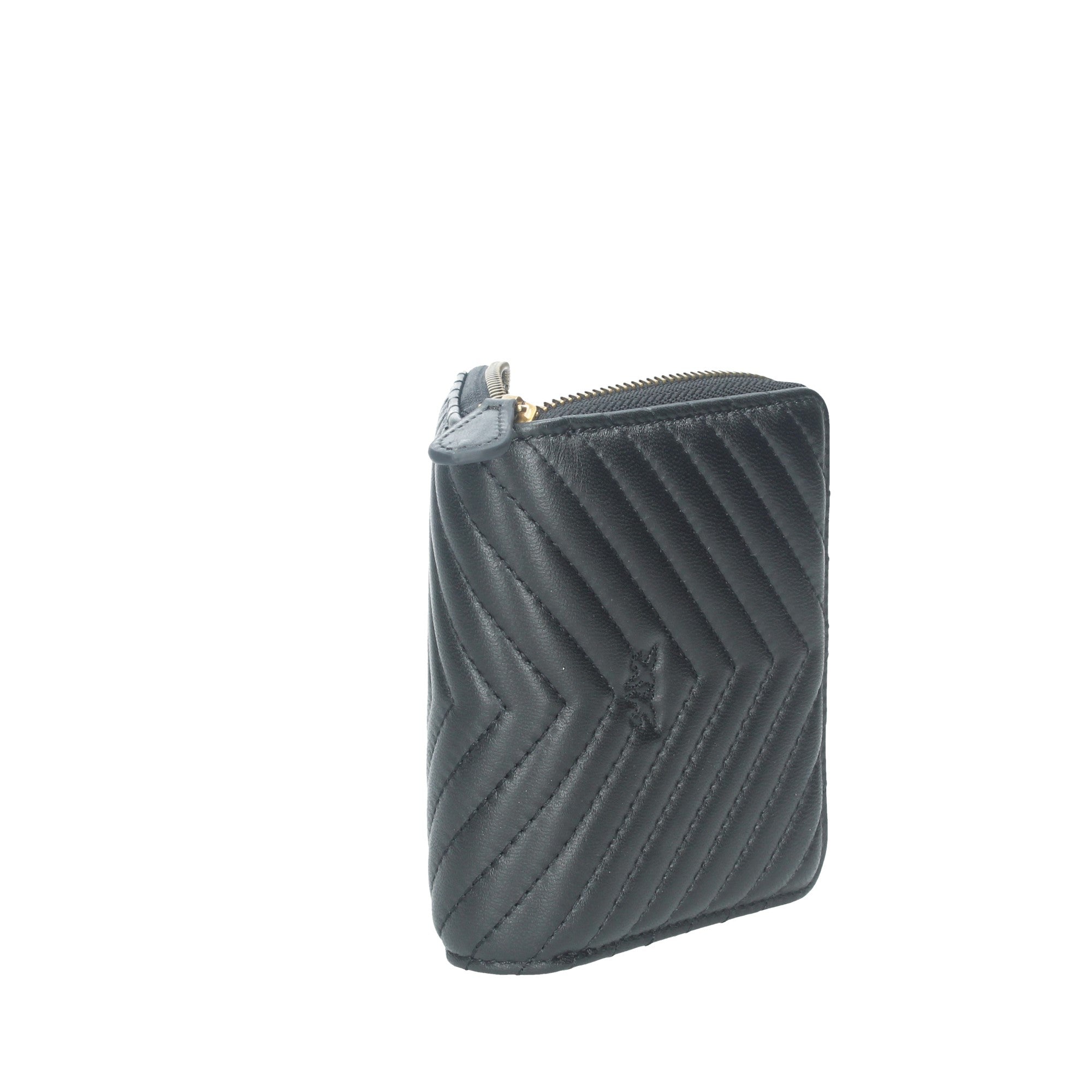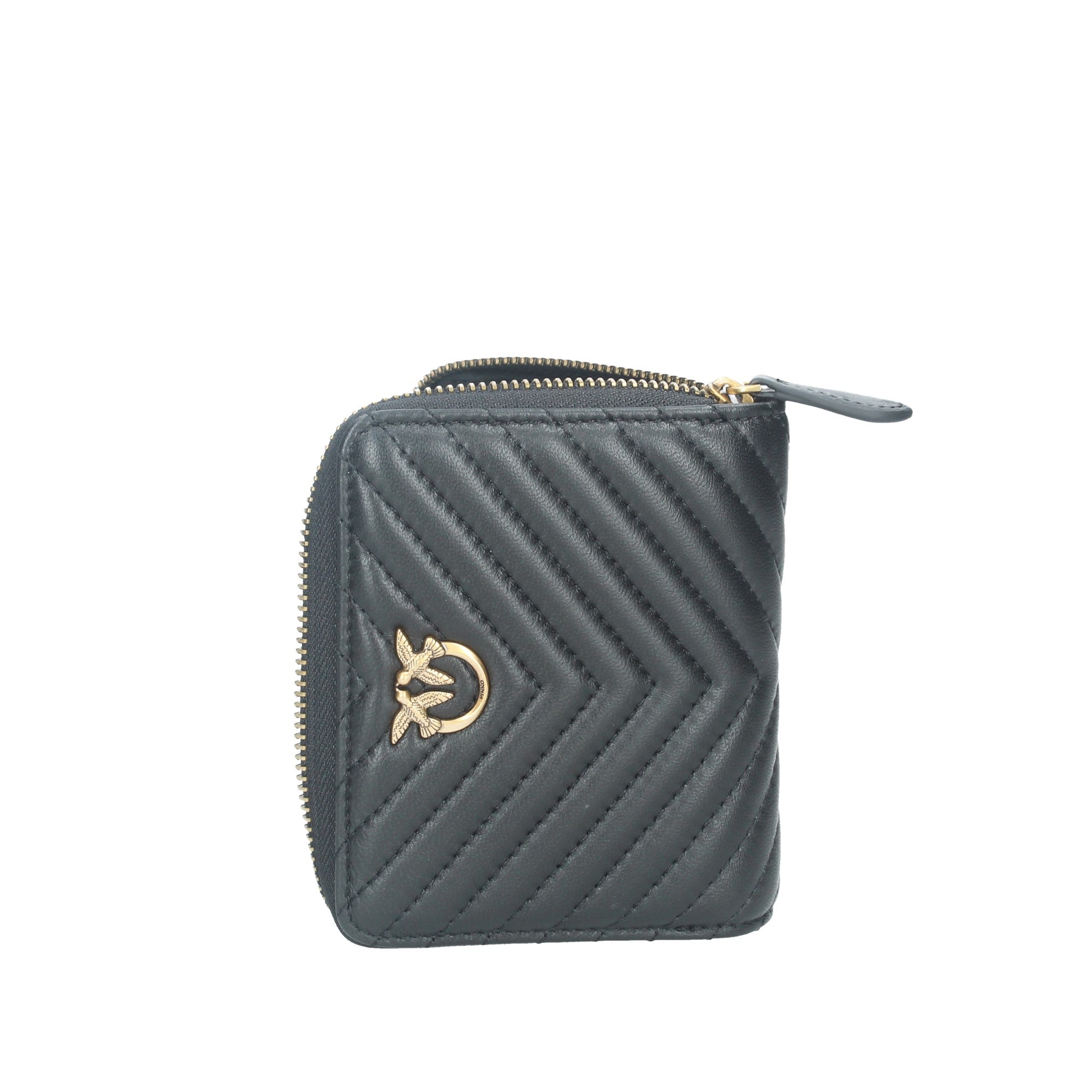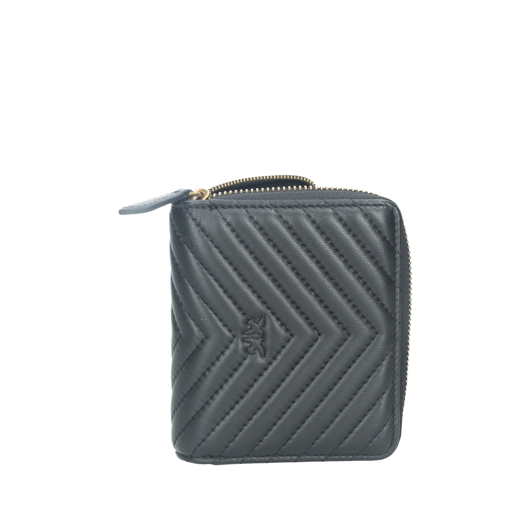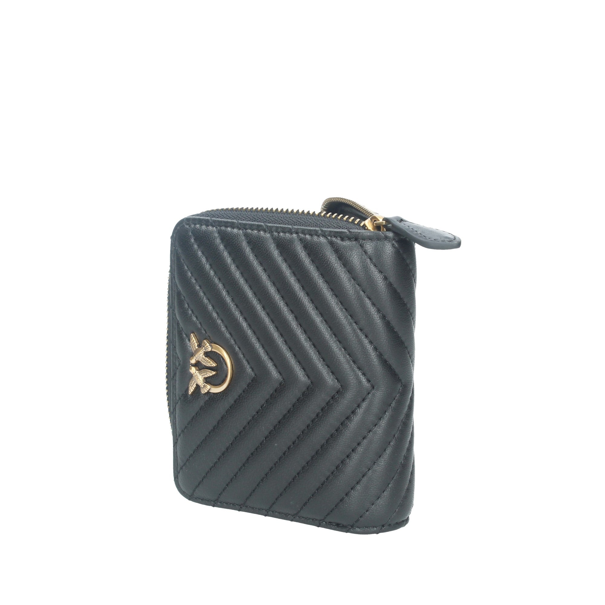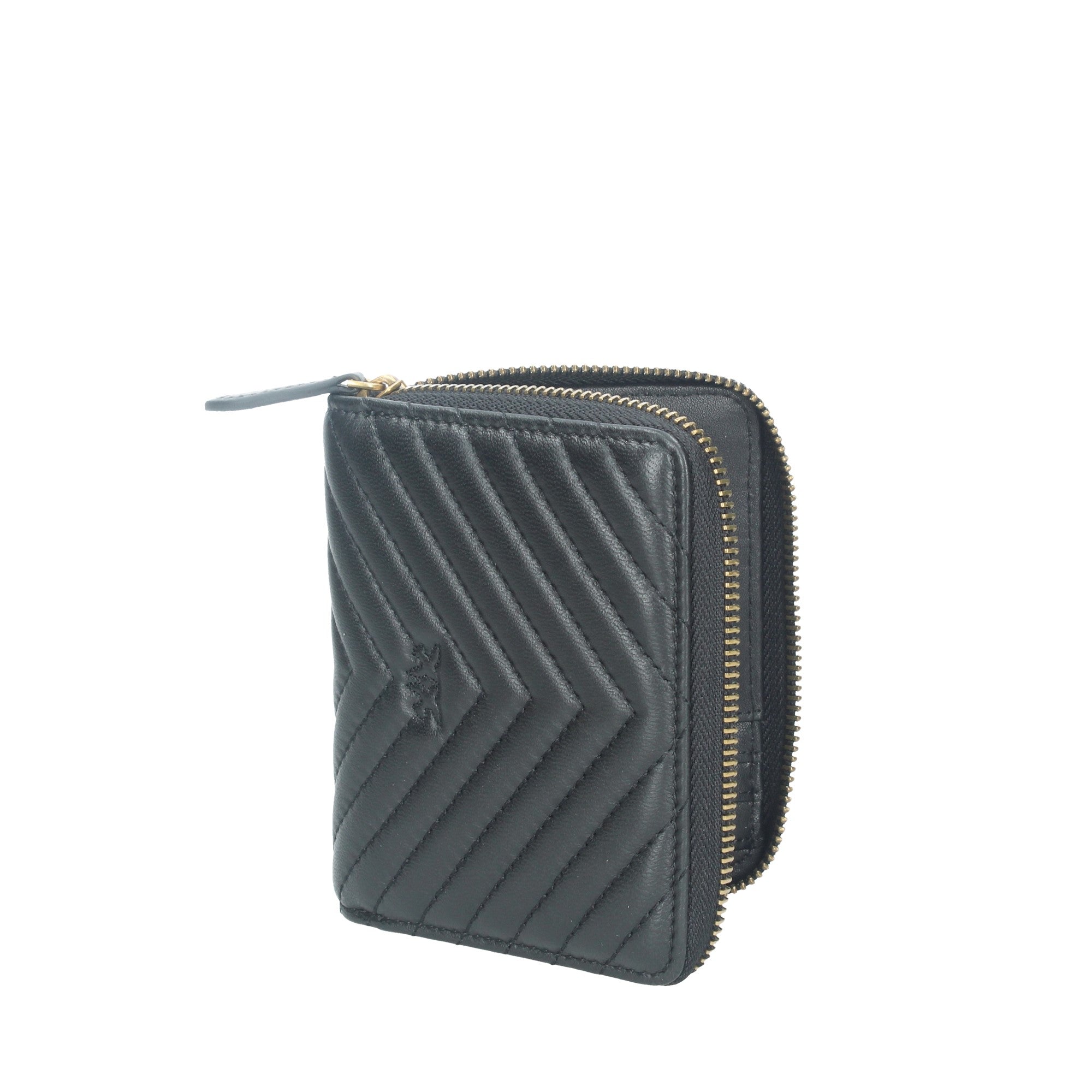 Portafogli Pinko in nappa trapuntata. Logo "Love Bird Diamond" in metallo Dorato davanti. Chiusura con zip. Scomparti per banconote. Quattro scomparti per le carte. Tasca con pattina con bottone automatico per le monete. Logo "Pinko" all'interno.