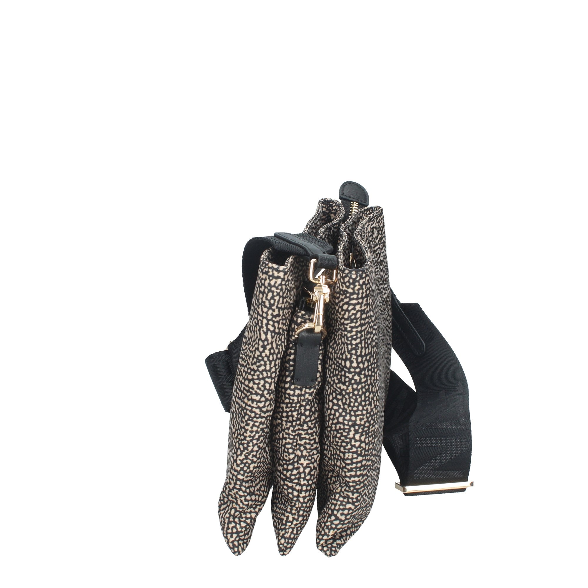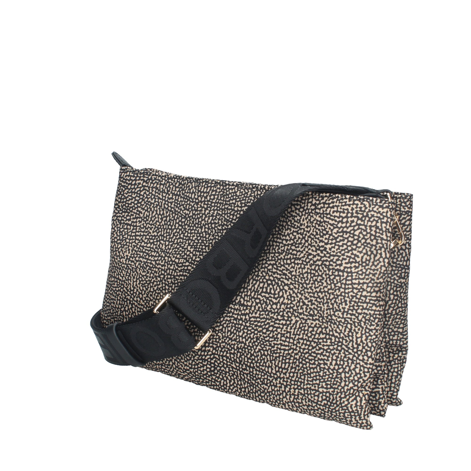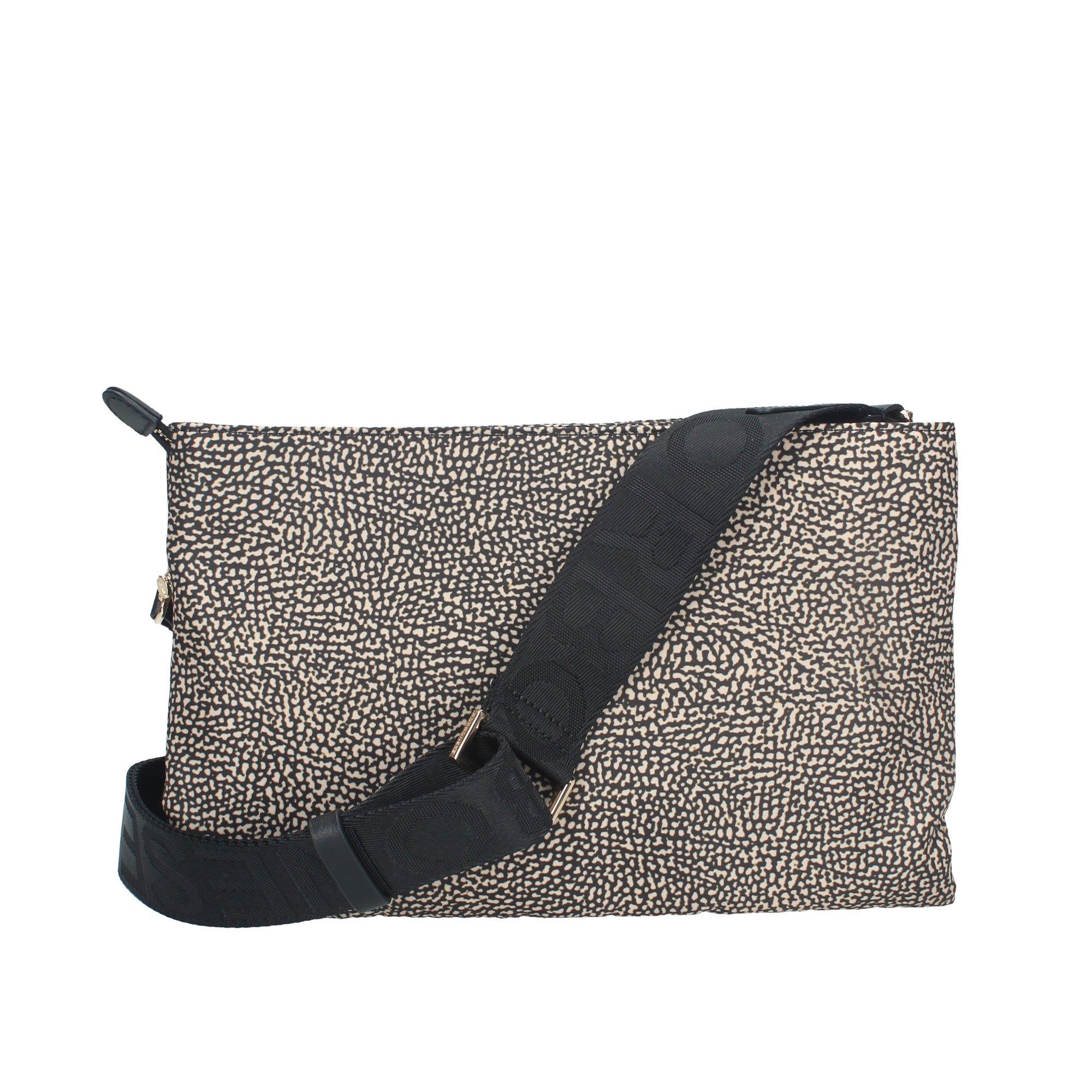 Borsa a tracolla in nylon op, altezza 17 cm larghezza 27 cm profondità 4 cm, tracolla di nastro di nylon logato regolabile con fibbia autobloccante, dettagli metallici in galvanica oro chiaro, scomparto centrale con chiusura con zip con tira zip in metallo due scomparti con chiusura con bottoncino tasca interna a fessura, etichetta di pelle interna con lettering impresso, interno foderato in tessuto jacquard