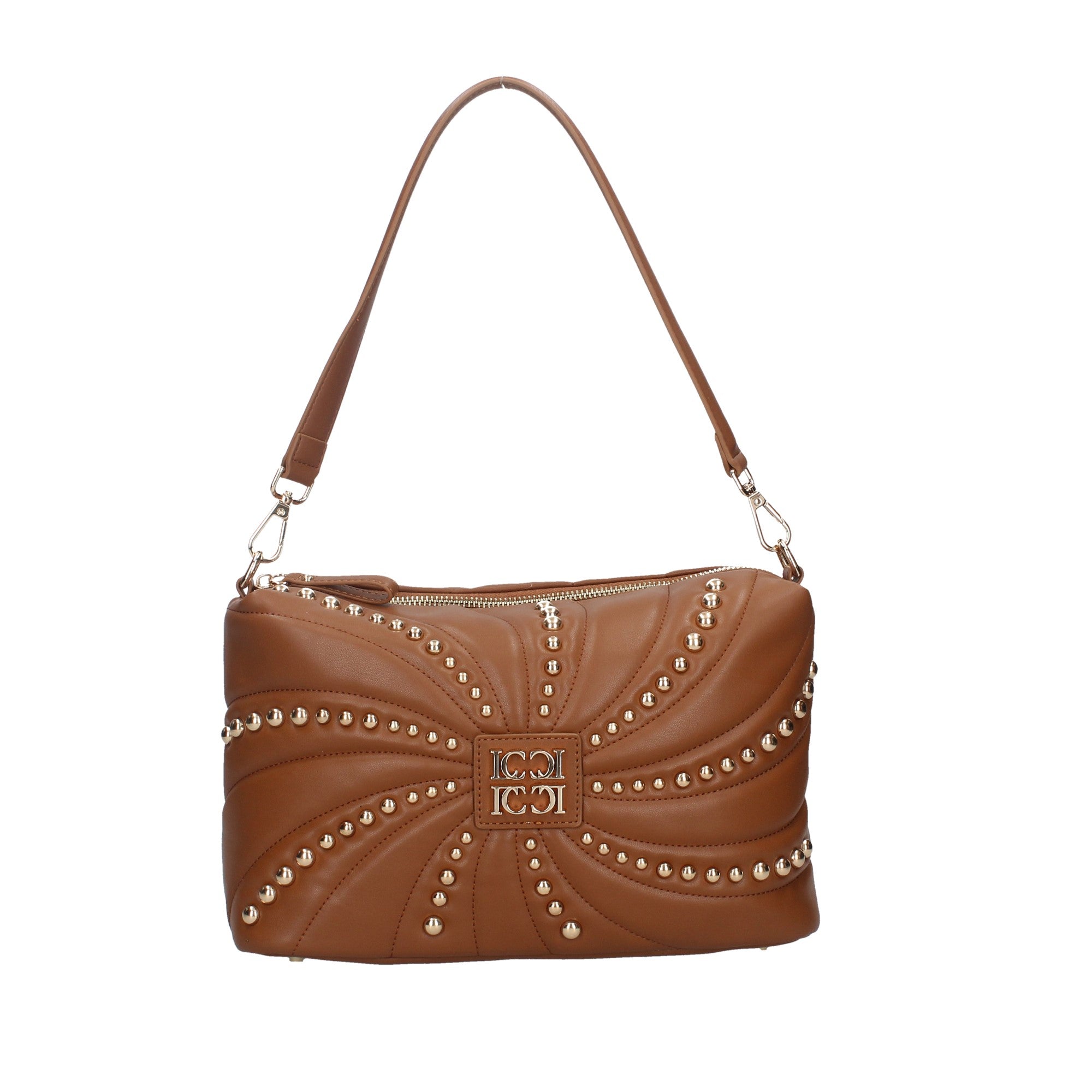 Cuciture a spirale con borchie dorate. Interno con fodera e tasche porta oggetti. Chiusura con cerniera.