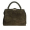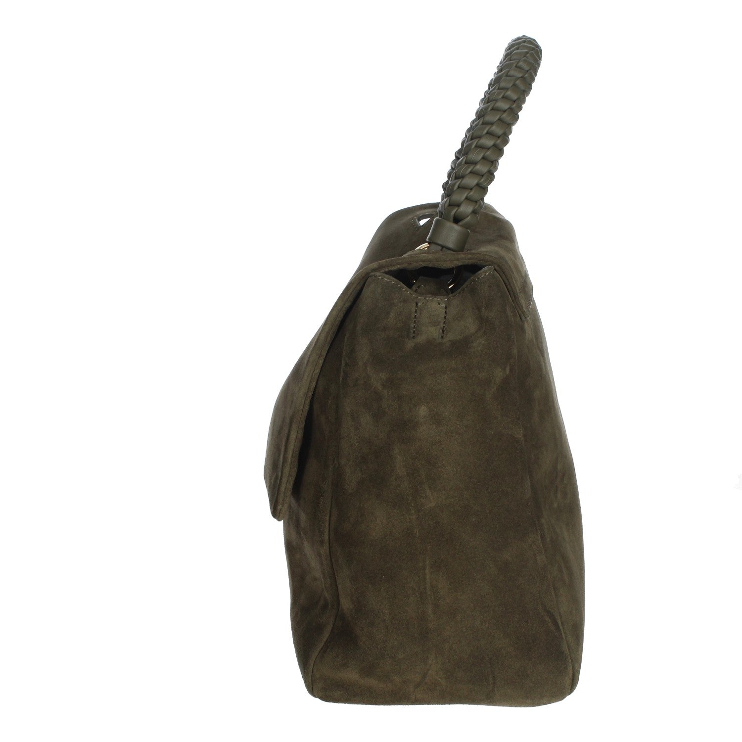 Dimensioni: Larghezza: 32 cm / Altezza: 24 cm / Profondità: 15 cm Tasche: taschino interno con zip Chiusura: patta con bottone magnetico Funzionalità: apertura a scomparsa sulla parte alta della patta, manico intrecciato scooby a spalla e tracolla regolabile removibile Dettagli: finiture palladio Materiale: suede con dettagli pelle liscia Made in Italy