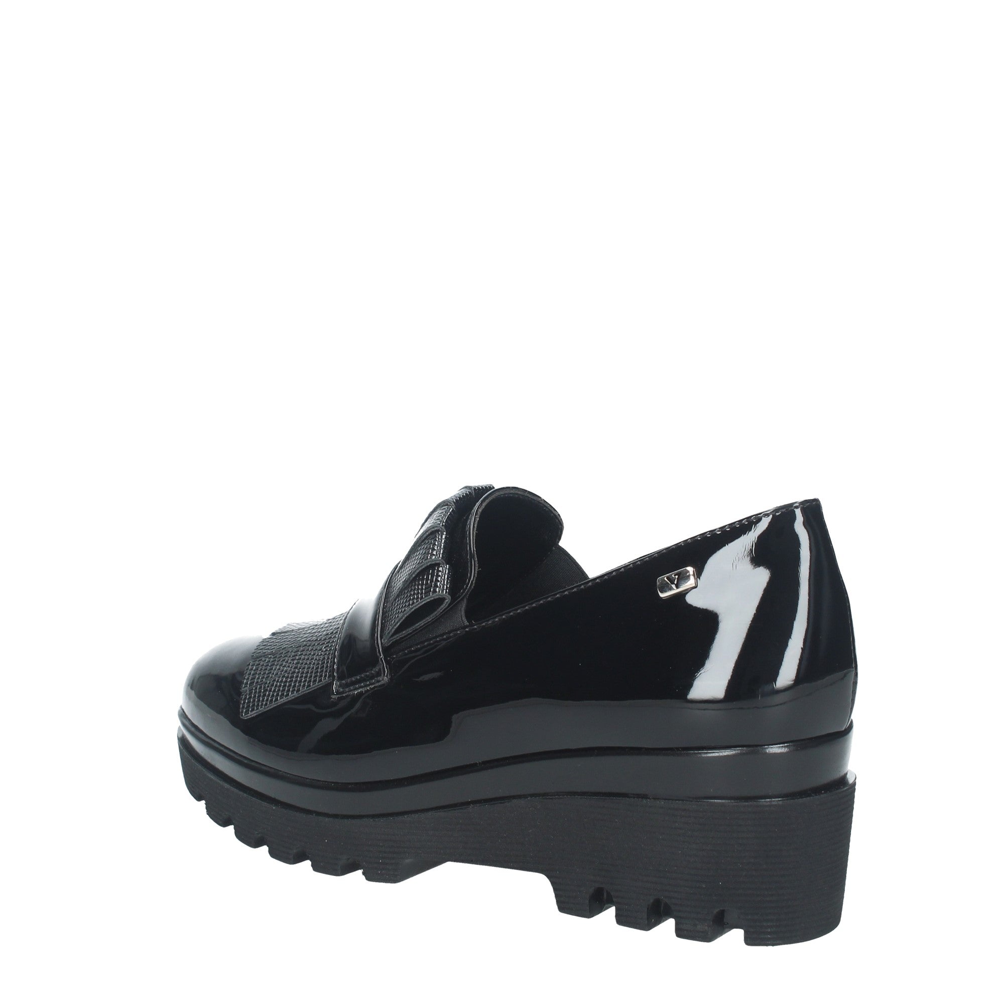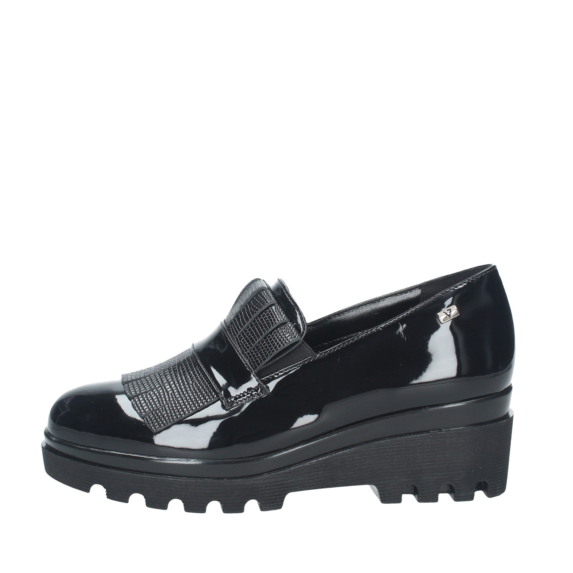Mocassino da donna Valleverde. Realizzate in materiale sintetico nero lucido con frangette stampate. Ultraleggere. Sottopiede in pelle. Suola in gomma. Zeppa di 6 cm. Facili da calzare grazie ai due elastici laterali. Dallo stile casual, sono perfette per essere indossate con ogni tipo di look.