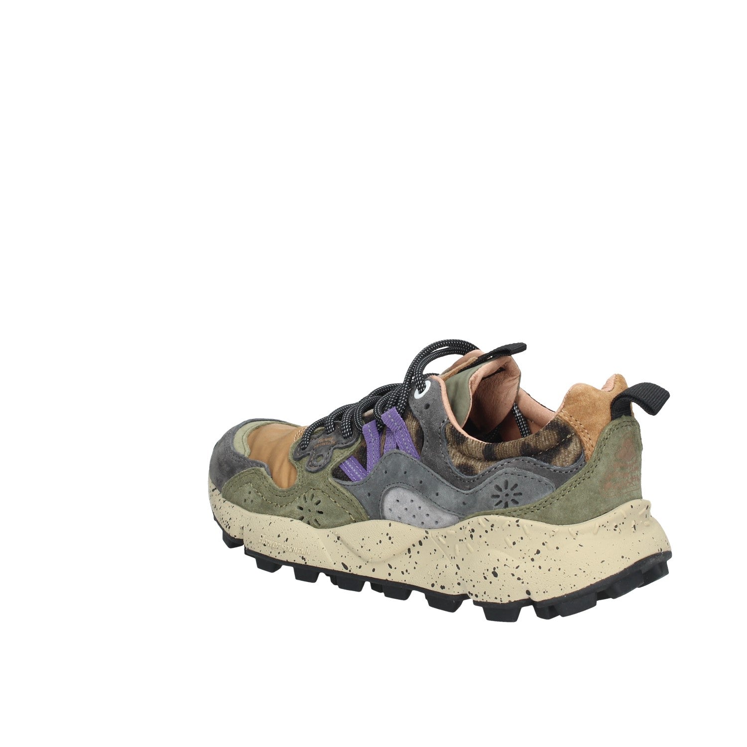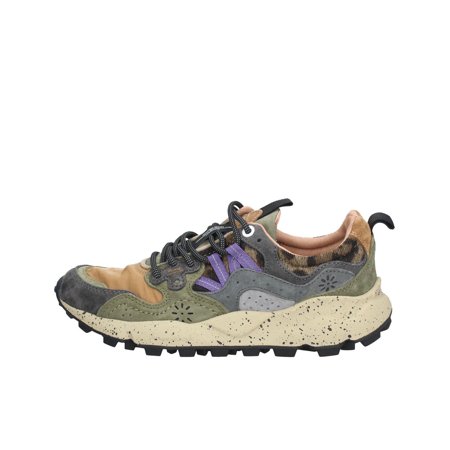Sneaker in tessuto tecnico con inserti in suede multicolor. Occhielli rinforzati e lacci trek. Soletta interna in sughero naturale antibatterico, fondo in gomma ultra leggera con battistrada dentellato.